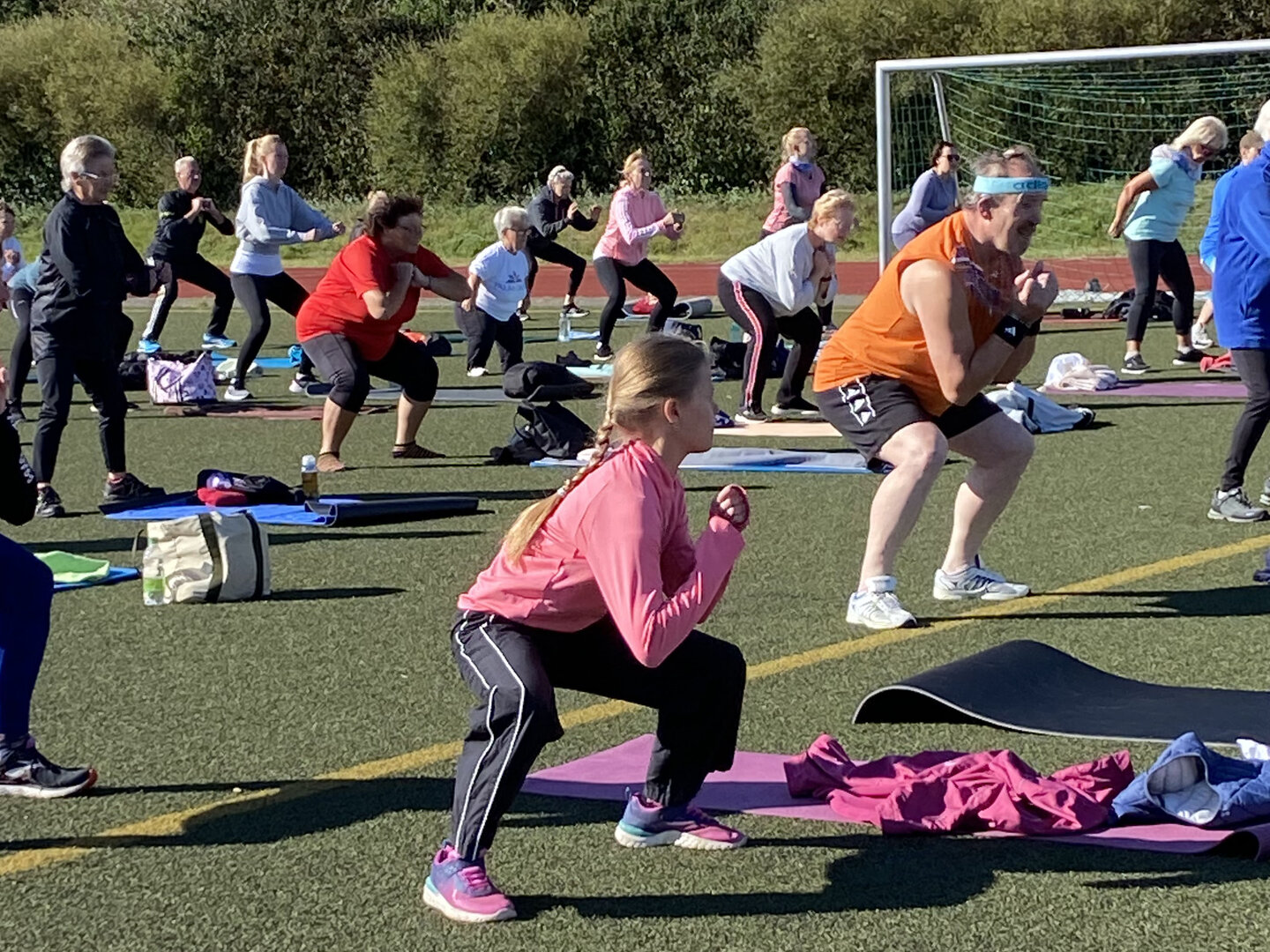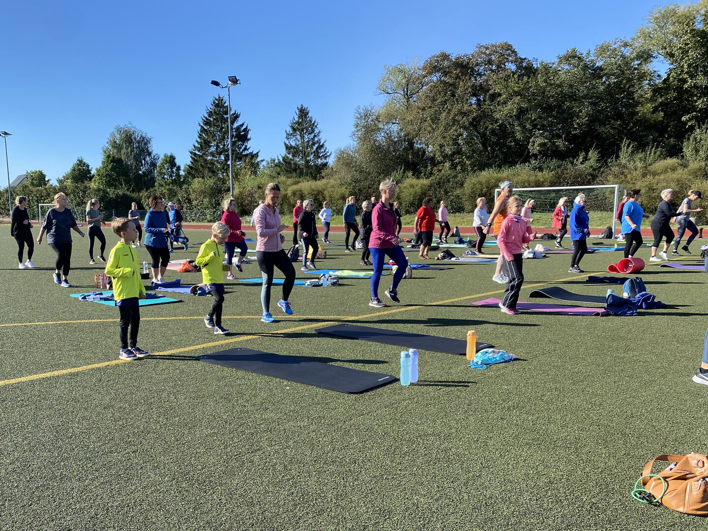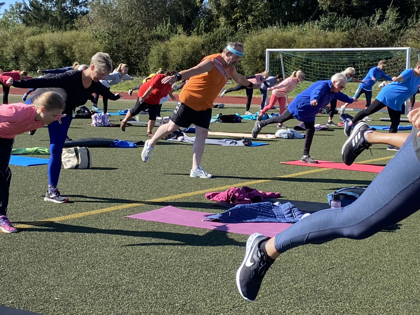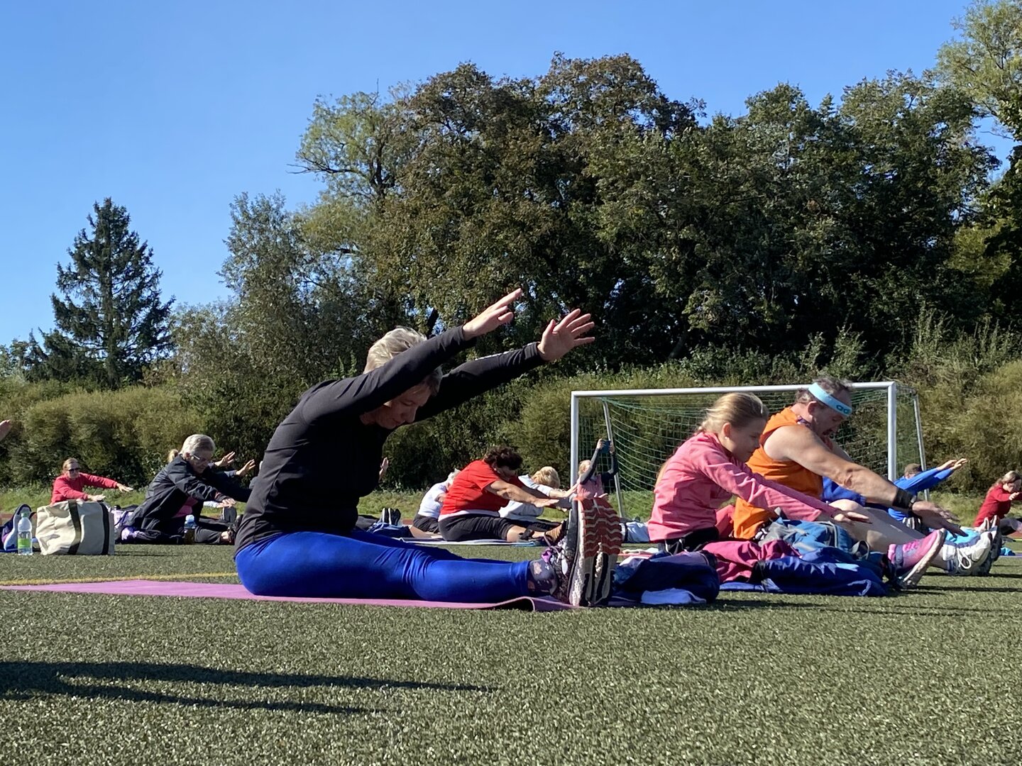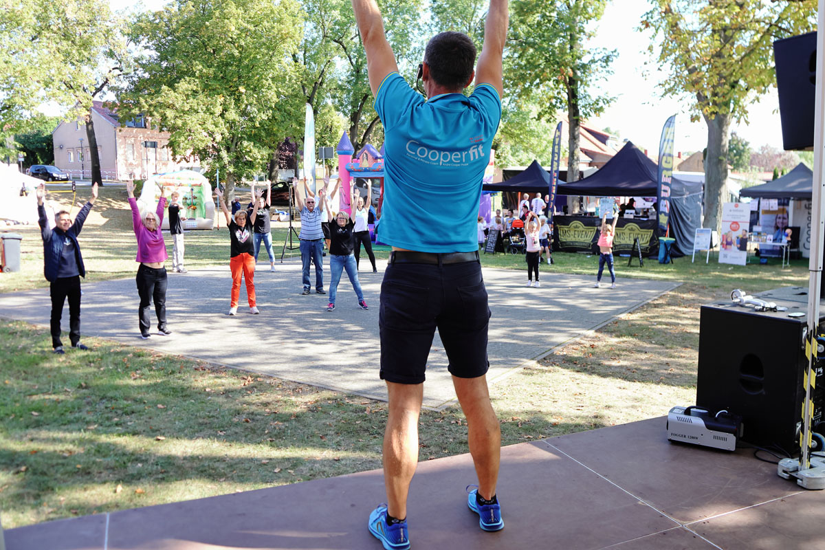 Das öffentliche Fitnesstraining am Sonntagmorgen war ein voller Erfolg. 60 Sportbegeisterte im Alter zwischen 7 und 87 Jahren trafen sich am 15.September bei strahlendem Sonnenschein auf dem Schulsportplatz in Vehlefanz, um ihre Körper in Schwung zu bringen für die folgende Arbeitswoche. Unterstützt wurde diese Initiative der Vehlefanzer "Montagshelden", die Sportgruppe des Heimatvereins, durch den Fitnesstrainer André Cooper Protze. Unter dem Motto "Gesundheit braucht Bewegung" leitete er die Sportbegeisterten sehr einfühlsam mit muskelaufbauenden Übungen an, deren Wirkung er auch erklärte. Viele fragten nach einer baldigen Wiederholung. Vielleicht können wir es zur Tradition werden lassen, wie es bereits in Oranienburg und Velten gepflegt wird.
