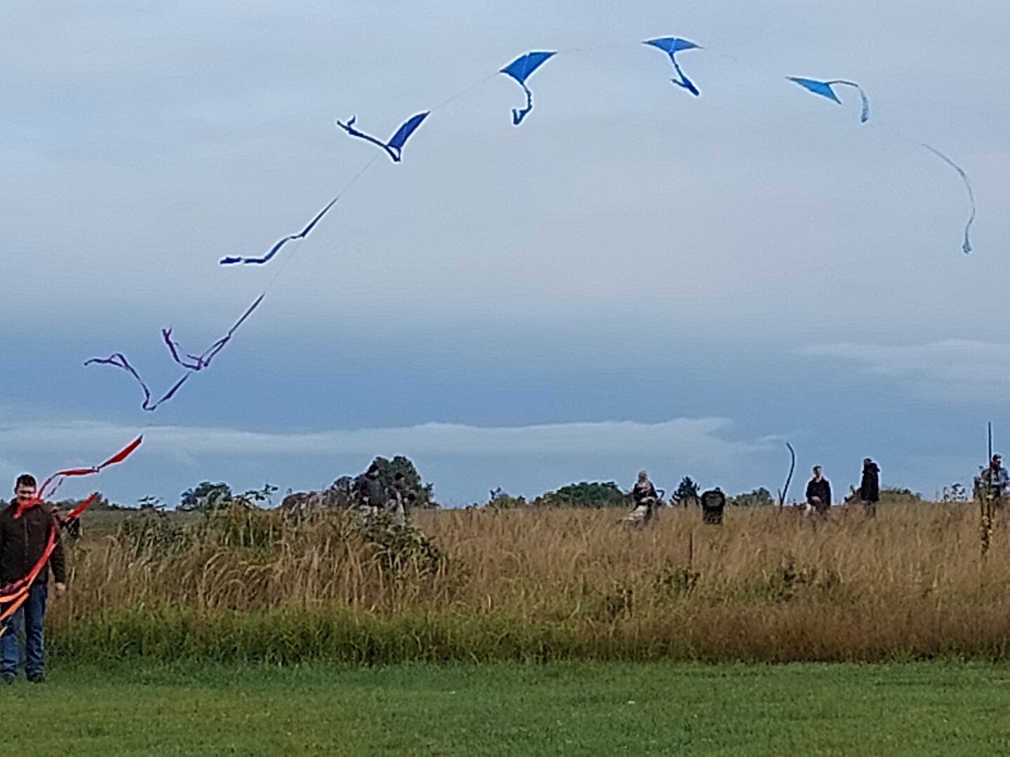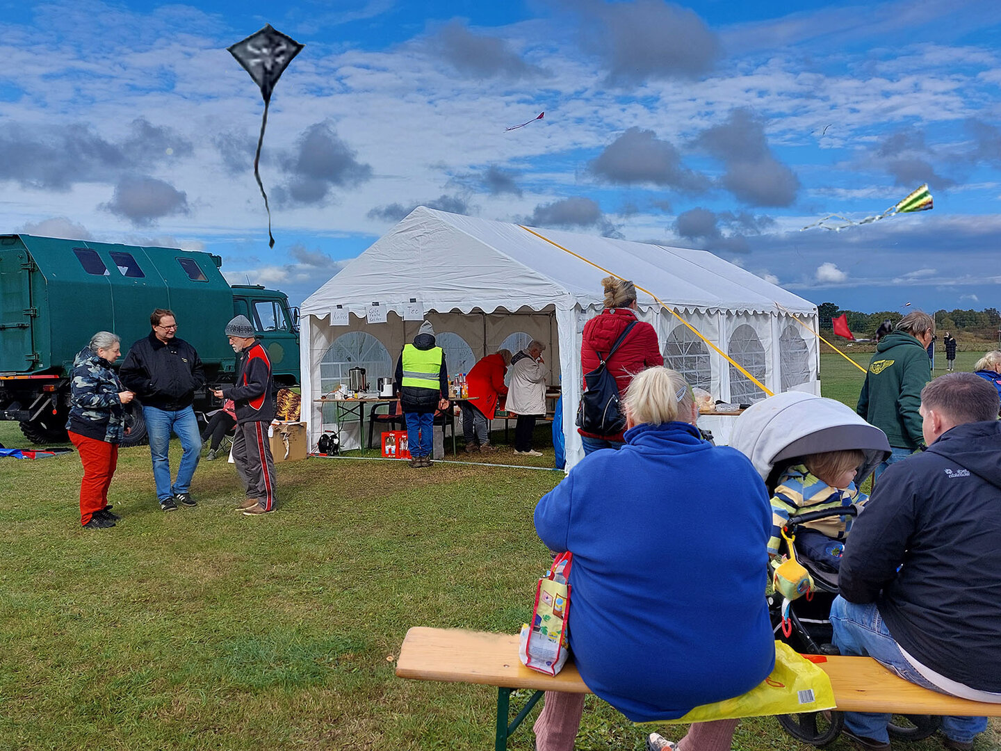 Bei durchwachsenem Wetter stiegen nach und nach viele bunte Drachen in den Himmel. Unsere Gastgeber sorgten für Grillwurst und warme Getränke. Gegen 13.00 Uhr schloss sich dann noch eine kleine Flugshow mit den Modellflugzeugen an.