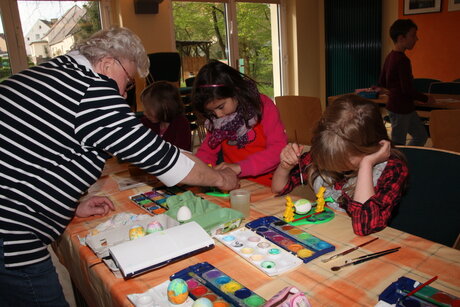 Die Klasse 2b der Nashorn-Grundschule Vehlefanz hilft an ihrem Projekttag dem Osterhasen im Haus der Generationen bei Osterbasteleien. Drei Stunden Eier bemalen und marmorieren, Blumentopfhasen kleben und Kekse backen. Dann toben sich die Kids auf der Wiese und der Hüpfmatte aus.